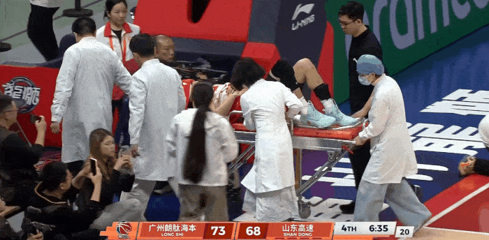 比賽進(jìn)行到第四節(jié)時(shí),廣州龍獅隊(duì)球員郭艾倫在一次突破對抗后意外傷及膝蓋。倒地瞬間,他下意識用手握住左腿膝蓋,表情痛苦。隨后,現(xiàn)場醫(yī)療人員迅速進(jìn)場,用擔(dān)架將他抬離場地。