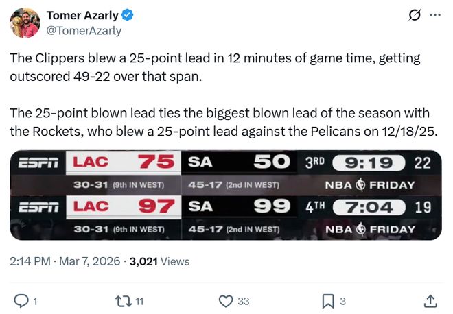 25分驚天大逆轉也成功追平本賽季最大逆轉分差,此前這一紀錄由鵜鶘逆轉火箭保持。