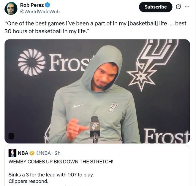 雖然只是一場常規(guī)賽,但能夠完成如此夸張的大逆轉,對手還是昔日核心小卡帶領的快船,賽后馬刺球員十分激動,全員瘋狂慶祝,文班更是直接抱著隊友喜極而泣。