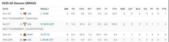 近兩周,于泓凱依舊穩(wěn)定獲得出場(chǎng)機(jī)會(huì),也很好地控制了犯規(guī)問題,四場(chǎng)比賽僅出現(xiàn)1次犯規(guī)。在賽區(qū)錦標(biāo)賽四分之一決賽中,他出場(chǎng)11分鐘得到4分2籃板,幫助球隊(duì)加時(shí)擊敗對(duì)手晉級(jí)賽區(qū)半決賽,可惜球隊(duì)不敵對(duì)手無緣晉級(jí)。后續(xù)若布拉德利未被邀請(qǐng)參加其余季后賽事,于泓凱本賽季的比賽就全部結(jié)束。