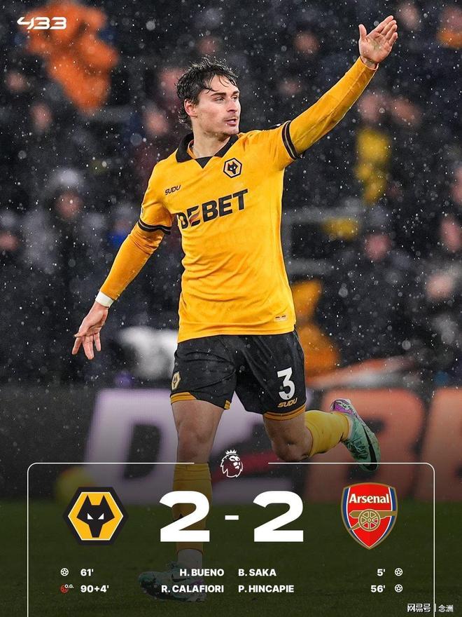 英超第31輪,阿森納客場2-2狼隊,先賽一場情況下5分優(yōu)勢領(lǐng)跑。薩卡破門打破15場進球荒,賴斯助攻,因卡皮耶打入個人處子球,圣地亞哥-布埃諾扳回一球,薩卡傷退,埃多齊補時絕平。