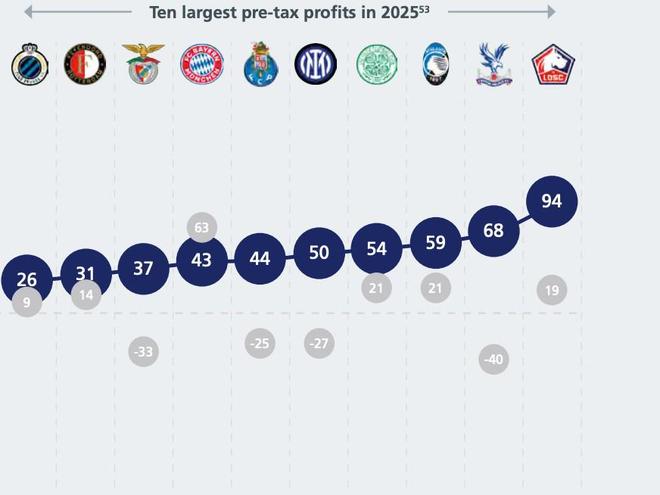 歐足聯(lián)統(tǒng)計2025年歐洲稅前盈利最多的10家俱樂部: