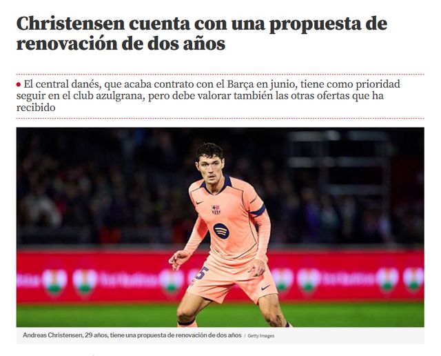 由于左膝前交叉韌帶部分撕裂,克里斯滕森還在養(yǎng)傷。3月6日,《世界體育報》透露,巴薩給克里斯滕森開出續(xù)約合同,但要求丹麥后衛(wèi)大幅降薪。今夏合同到期的滕森,首選留在巴薩。不過,丹麥后衛(wèi)還有來自沙特等多份邀約,并不急于做決定。