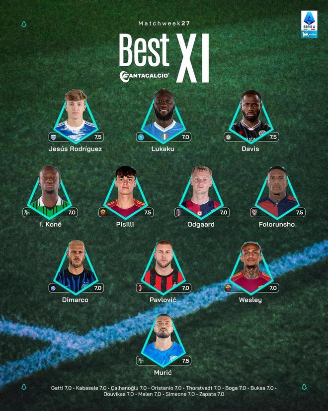 中場:伊斯梅爾-科內(nèi)(薩索洛)、皮西利(羅馬)、延斯-厄德高(博洛尼亞)、弗洛倫肖(卡利亞里)