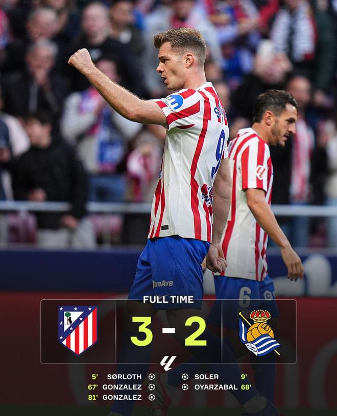 第81分鐘,尼古拉斯·岡薩雷斯在禁區(qū)內高高躍起頭球破門,上演梅開二度的同時也打進絕殺進球。最終,馬競3-2險勝皇家社會,收獲聯賽三連勝。